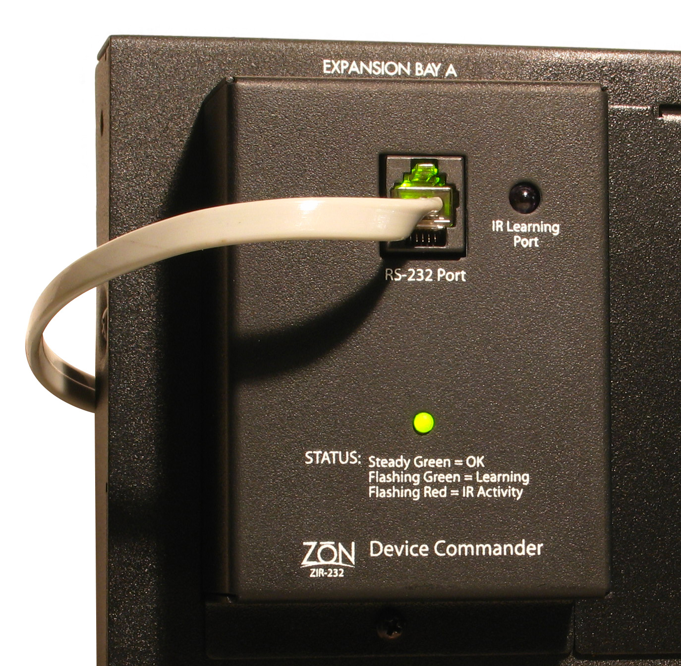 In addition to IR control, the Device Commander features a bi-directional RS-232 port to extend control capabilities to home automation and home entertainment devices. Control commands stored in the ZIR-232 are integrated with the ZON ZAC-60's revolutionary user interface and the ZON Router's on board RS-232 port. Icons and/or text labels are assigned to stored commands and can be selected directly from a ZAC-60 display. Custom command configuration software allows full integration with the ZON system.